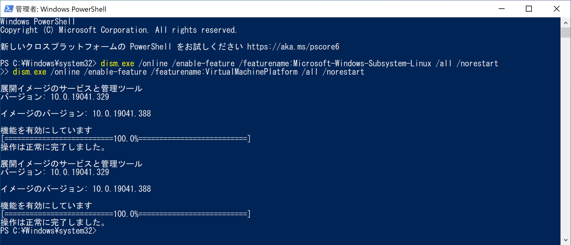 以下のコマンドを用いて WSL と仮想マシン プラットフォームを有効にします。有効 化が終わったら、端末を再起動してください。